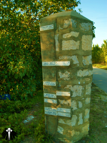 Nesse caso, continuando a seguir as setas em volta da pista de pouso e decolagem de pequenos aviões encontra-se a primeira placa dos albergues de Santarém. E o mais engraçado... Com um número de resgate!? Meio intrigante esse número, mas depois acredito que ele deve ser muito útil para alguns.
