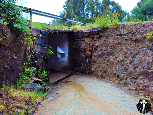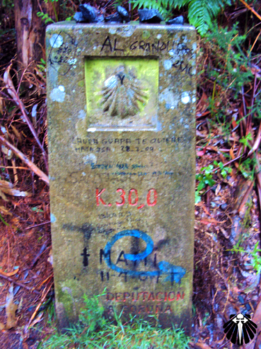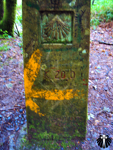 Continuando, o Caminho segue pela trilha entre os eucaliptos, onde encontra-se o marco de 20 Kms até Santiago e mais uma vez é necessário cruzar a carretera através de um túnel.