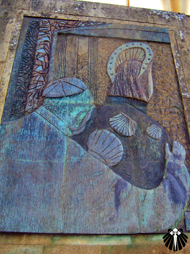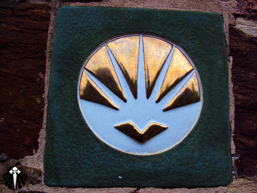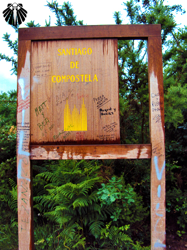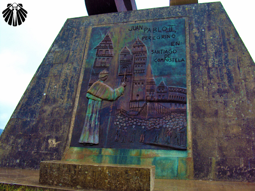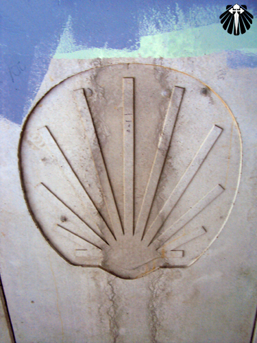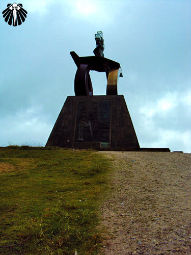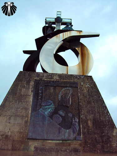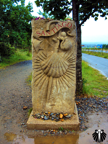 Um monolito com o bastão, a cabaça e a vieira esculpidos dão boas vindas a todos os peregrinos à Santiago.