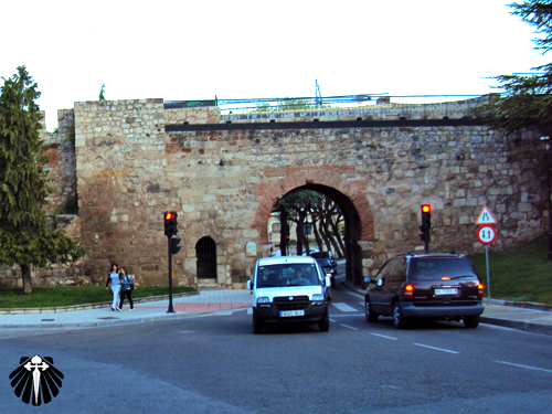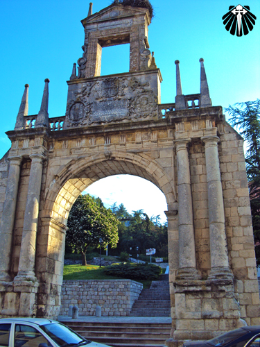 As setas amarelas seguem entre as ruas movimentadas de Burgos até as antigas muralhas que cercam a cidade, onde se encontram novamente com o Rio Arlanzón.