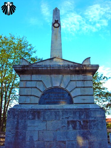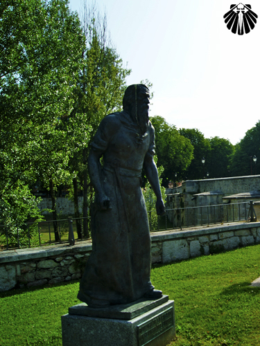 O Caminho de Santiago segue sobre a proteção e sombra de frondosas árvores e na companhia de estátuas de bronze em homenagem aos peregrinos.