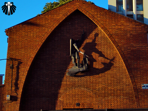 Uma pequena igreja com uma estátua de ferro que lembra São Miguel Arcanjo em sua fachada, quebra um pouco a monotonia da caminhada até Virgen del Camino.