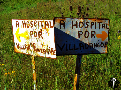 Na saída do povoado, uma placa informativa indica dois Caminhos alternativos, um até Villadangos e outro até Hospital de Órbigo.