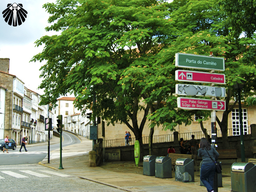 Não há necessidade de voltar o caminho para o albergue para seguir caminho, descendo o pequeno monte, encontra-se facilmente a primeira seta amarela do dia em direção à Catedral de Santiago.