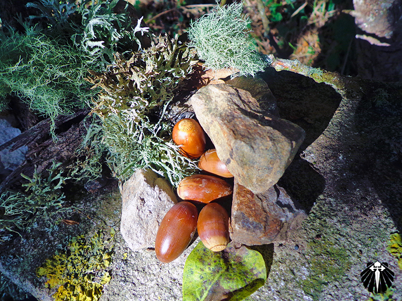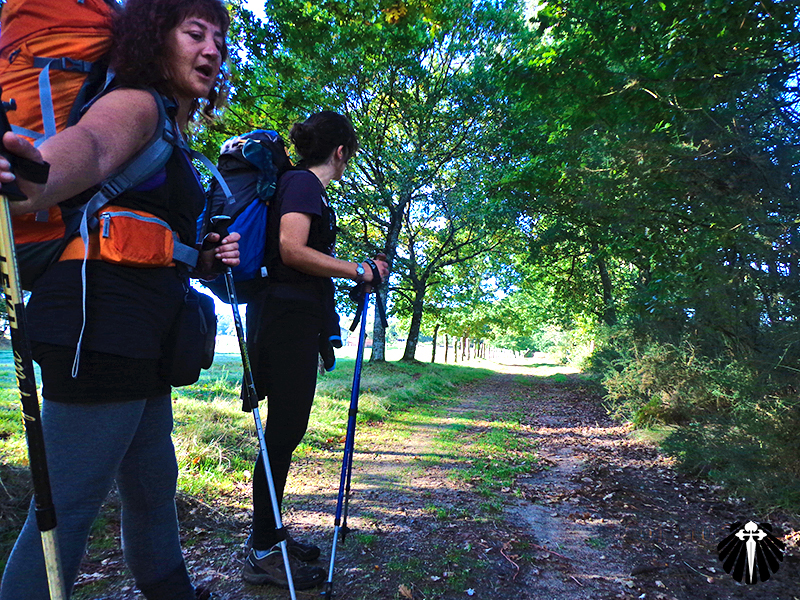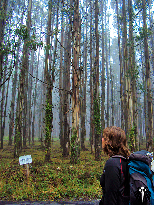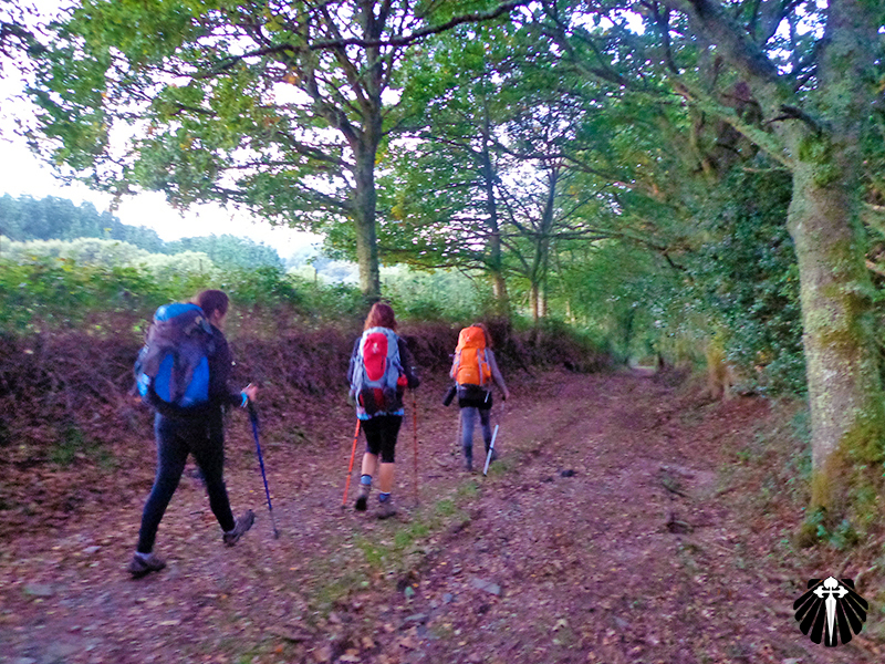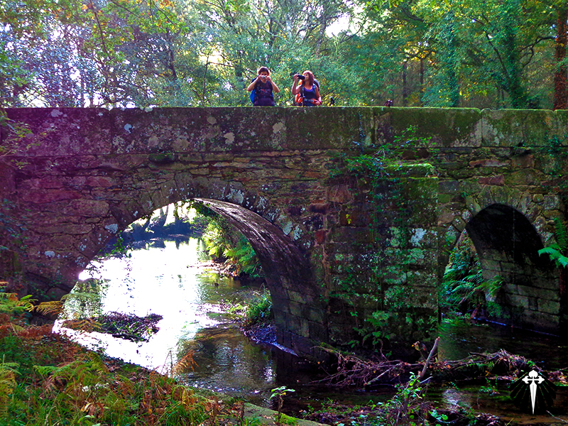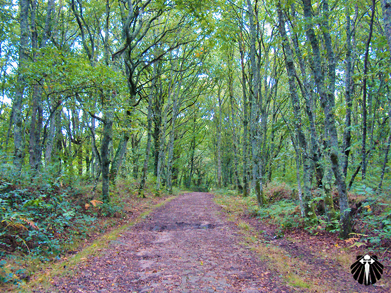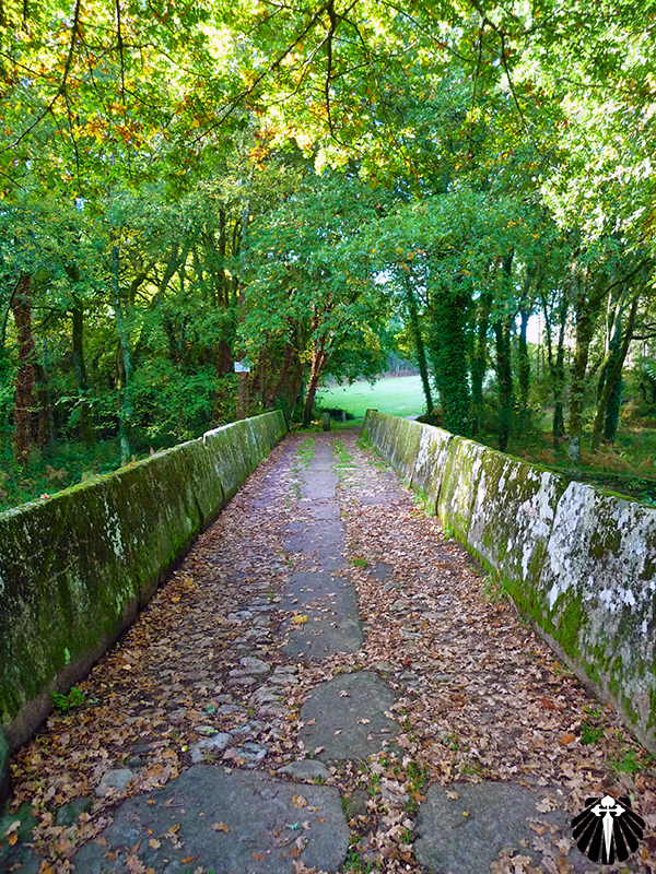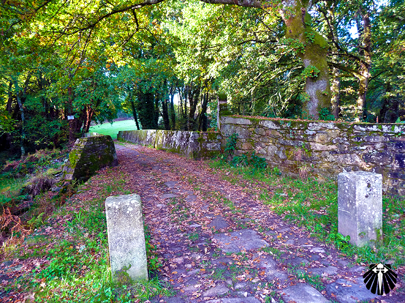 A trilha que segue entre o bosque de carvalhos se depara com uma ponte com cercado de madeira, que faz a travessia sob a rodovia nacional A-8, uma construção não muito usual nos Caminhos rumo à Santiago de Compostela.