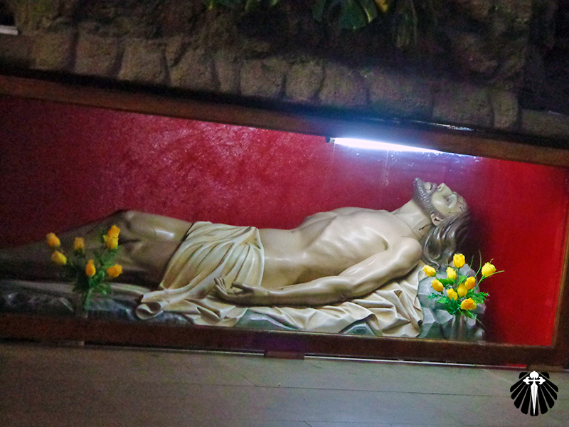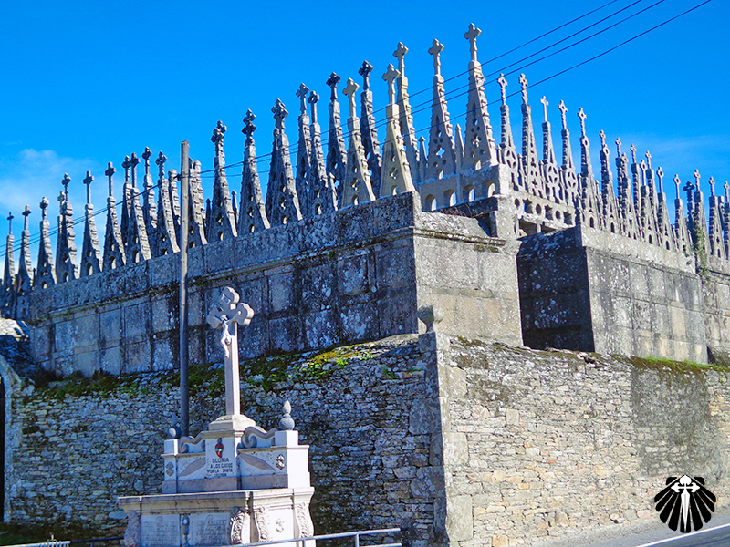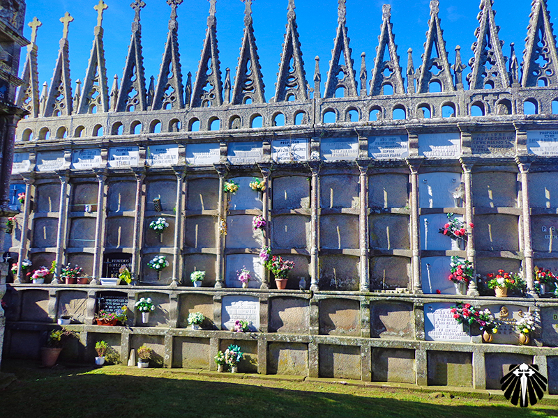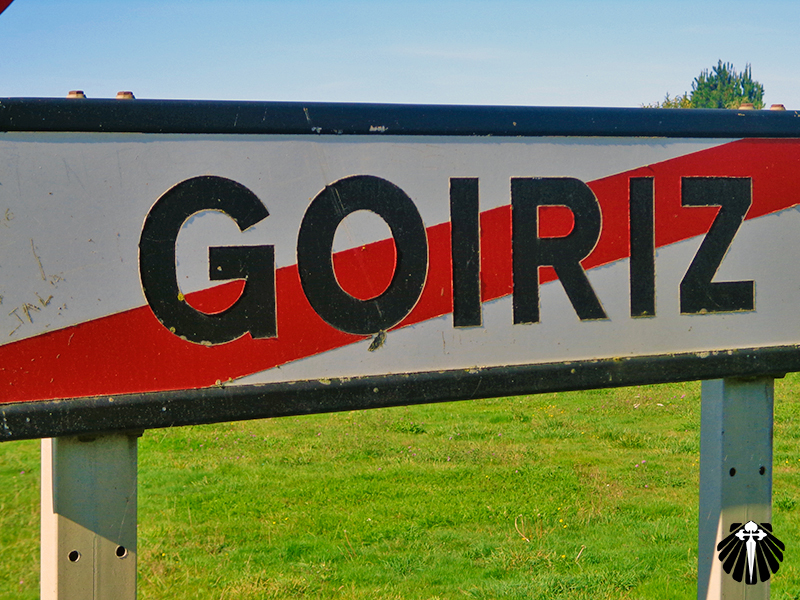 As setas amarelas seguem pela caarreteira local até a localidade de Goiriz, onde se encontra a Igreja de Santiago com cemitério característico anexo.