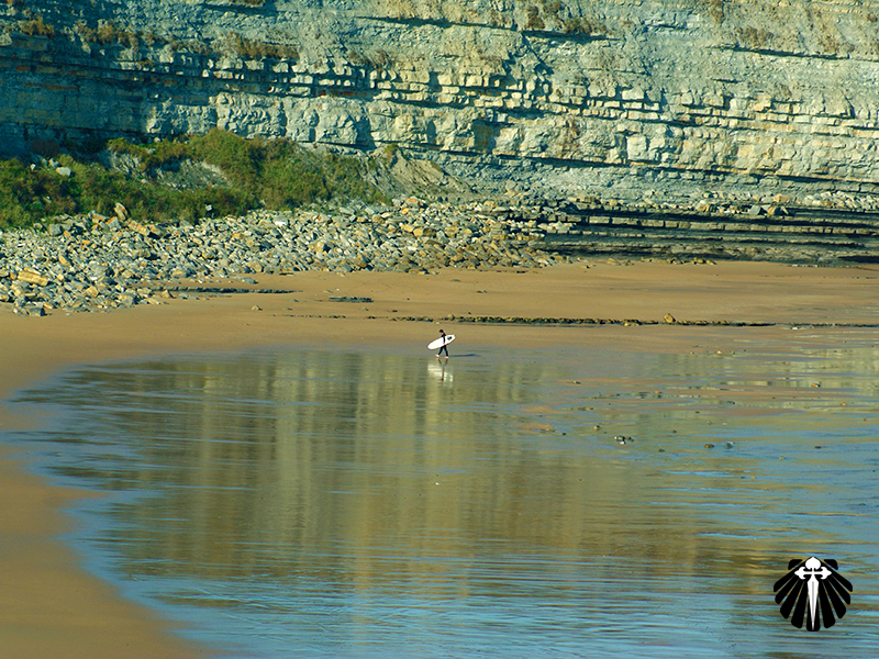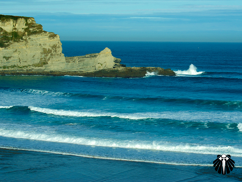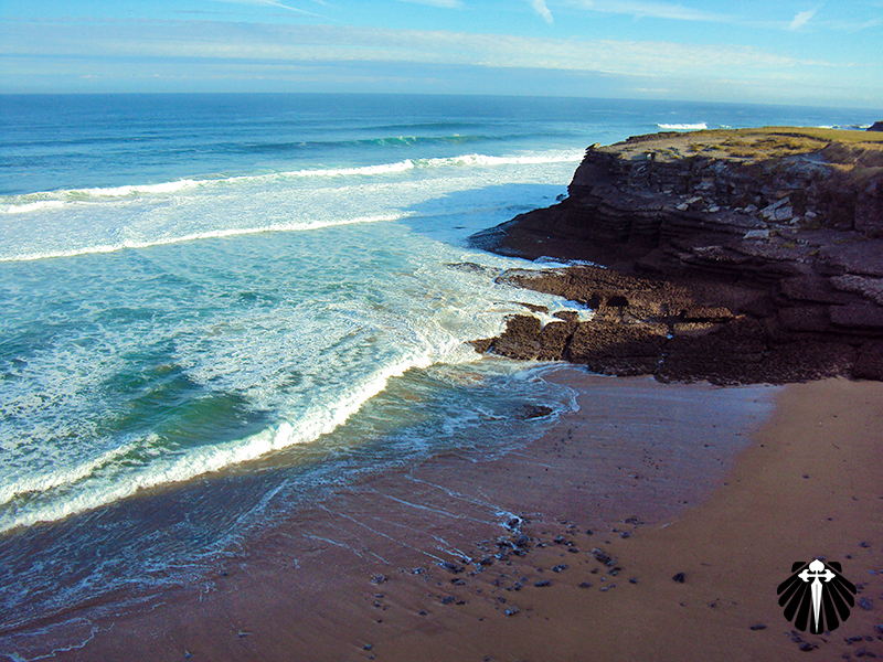 Pela rota "oficial", as setas amarelas atravessam o vilarejo de Galizano passando em frente à Igreja de Nossa Senhora da Assunção e em direção à praia de Galizano, onde é possível ver vários surfistas disputando as ondas pela manhã.