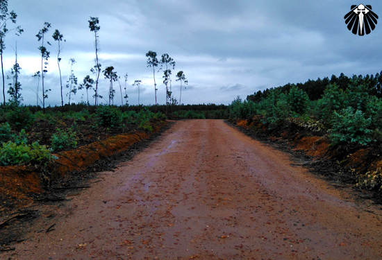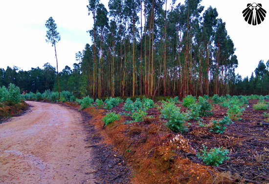 As setas agora se encontram na localidade de Serém, onde o peregrino atravessa todo o povoado pela Rua Central e acessa uma estrada de terra à esquerda cercada por eucaliptos, mais uma área de reflorestamento e manejo sustentável.