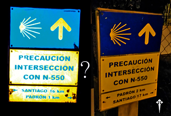 As setas amarelas iam em direção a Igreja de Iria Flávia não muito longe dali. Na primeira travessia da carreteira uma placa indicava a distância de 16 km a Santiago e 1 km de Padrón.